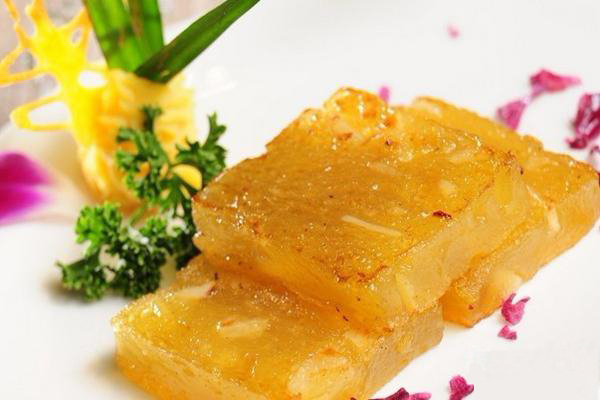 采用广西特产马蹄粉、罗汉果、蔗糖制成。其特点是糕体透明,爽滑带韧。同时还具有罗汉果润肺止咳、生津止渴的功效,是一种极好的清凉食品。