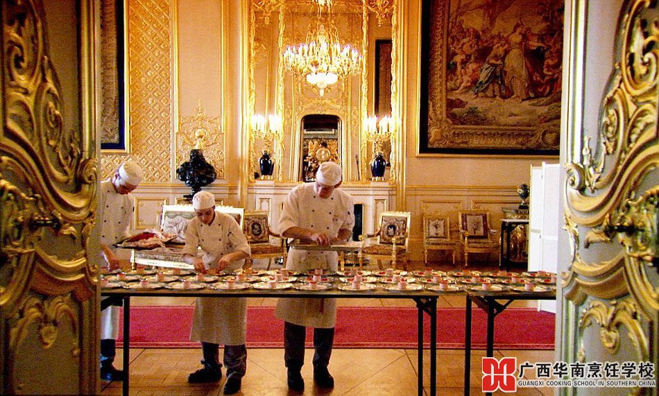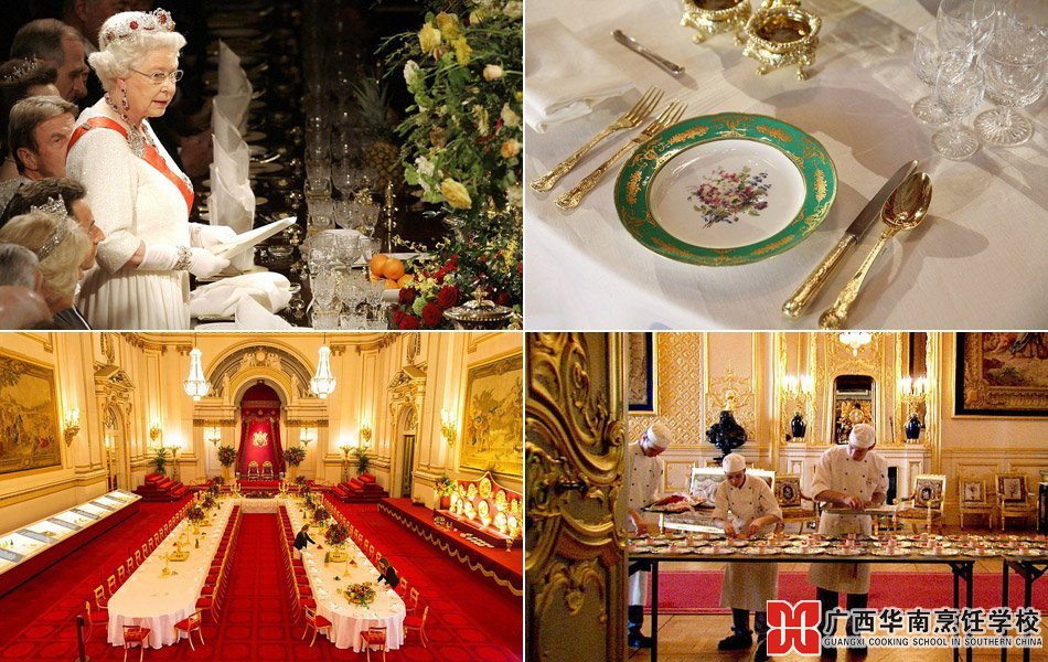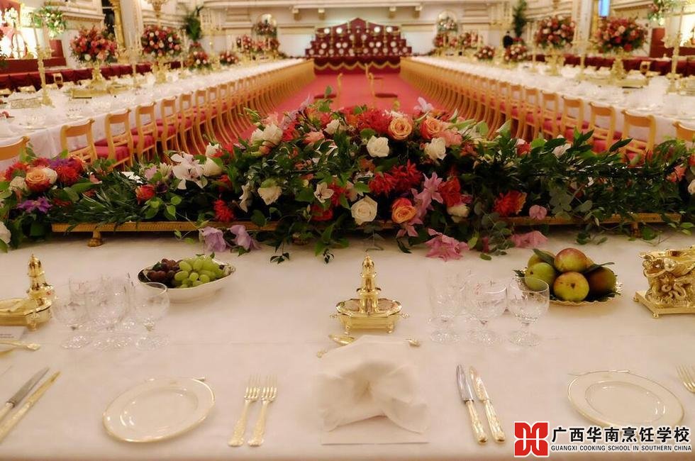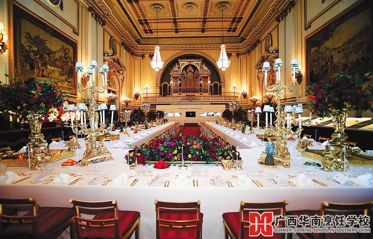 国宴当天,白金汉宫宴会厅会在大长条桌上摆满金碧辉煌的餐具,每套餐具间必须精确相差46厘米,即使最熟练的侍从也要依靠有毫米刻度的尺子来给每套餐具定位,准备一场国宴要花费约10天。