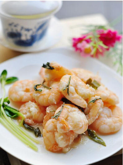 龙井虾仁因选用清明节前后的龙井茶配以虾仁制作而得名。成菜后,虾仁白嫩、茶叶翠绿,色泽淡雅,味美清口。