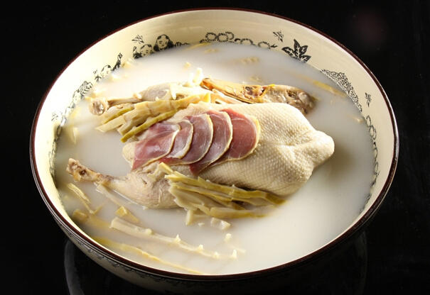 汤醇味浓,油而不腻,酥而不烂,生津开胃。老鸭煲的主料取自江南土鸭,即中华绿头鸭,为保持肉质鲜嫩,孵化出壳后,60天生长期内为最佳,以砂锅煨制而成。
