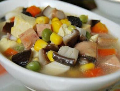 康熙在位时十分喜食质地软嫩、口味鲜美的菜肴。御膳房用优质黄豆做成的嫩豆腐,加肉末、火腿末、香菇末、蘑菇末、松仁末,用鸡汤烩煮成羹状。康熙品尝后,感到豆腐绝嫩,口味鲜美异常,极为满意。他认为此菜有两大特点:一是取用豆腐、香菇、松仁等长寿之物为原料,可使人延年益寿;二是豆腐烹制得法,鲜美细嫩,胜于燕窝。