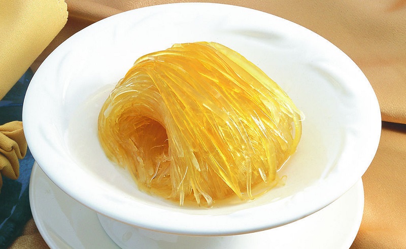 是名贵的海味佳品,其丝状体洁白透明,富有弹性,含有丰富的蛋白质、钙、磷等物质,常被作为上等菜肴之原料。鱼翅是用大鲨鱼的背鳍,脑鳍、尾鳍漂洗、晒干、吐腥后再入锅煮然后再刮除表皮的沙质、切片、抽丝而成高档翅饼。通常鳍的提取量只占鲨鱼体重的5%左右,所以显得稀有、难得,因而名贵。