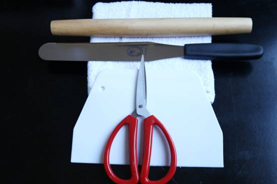 擀面杖、奶油抹刀、剪刀、塑料刮板、毛巾