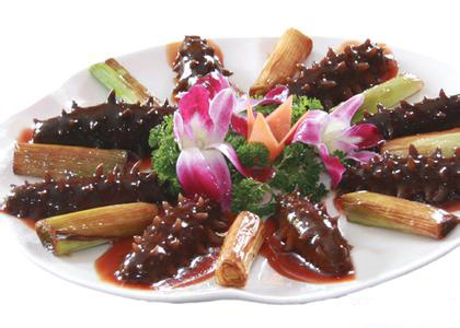 4、把炒勺放旺火上,倒入大油烧热,放入葱段炸成黄色捞出加入清汤、料酒、白糖、糖色、酱油、味精和毛姜水,烧开后撇去浮沫。而后将煨好的海参、炸好的葱段放入,汤再次烧开后,随即淋入湿淀粉勾芡。出勺加葱油,摆盘即成。