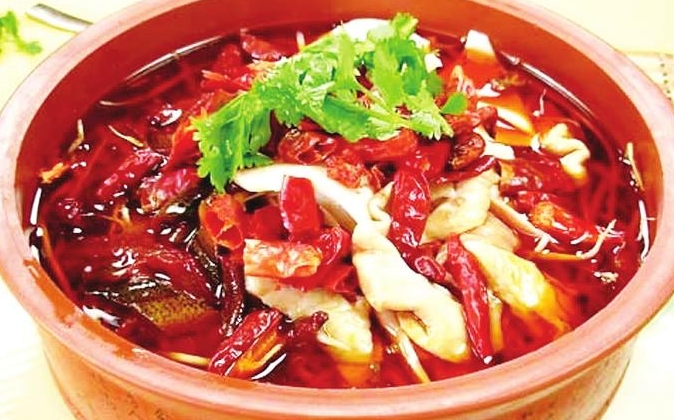 7、炒锅放入油,冷油小火放入花椒、辣椒,爆炒至微焦色,趁热将花椒、辣椒、油一起淋在鱼上即可。