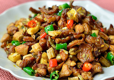 5、再将笋丁和茶树菇丁炸去大部分水分,待茶树菇有深皱纹时捞出沥油;