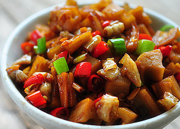 4、倒入提前浸泡并沥水的藕丁翻炒,加生抽和少许老抽;