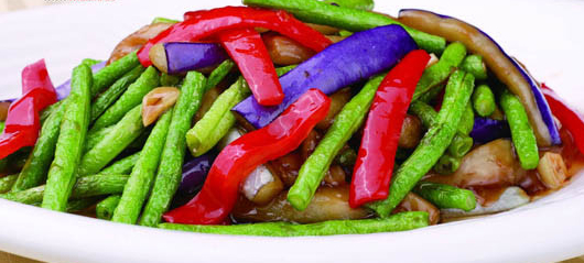 5、翻炒至豆角有八成熟时,就离锅,或茄子已开始透明,但未全透,这时起锅装盘即可。