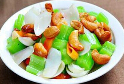 百合50克,西芹200克,胡萝卜100克,腰果50克,盐、白砂糖各适量。
