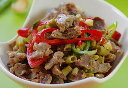 鸡胗250g、酸豆角2根、红椒1个、尖椒1个、青蒜1根、葱1根、小米椒2个、蒜4瓣、姜1小块、料酒1大勺、盐1/2茶匙、鸡精少许