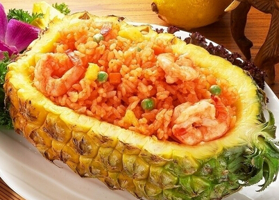 材料:熟菠萝一只、鲜虾仁、芹菜、蟹柳、红萝卜(切粒)、青瓜一条