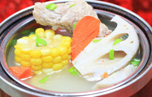 7、汤撇净浮沫,中火煮40分钟后加入玉米、胡萝卜和藕烧开;