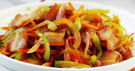 1、洋葱切丝,胡萝卜去皮切丝,青椒切丝,五花肉切薄片;