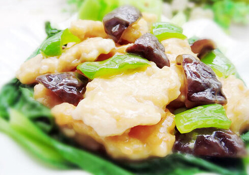 调料:蛋清 (2个)、油菜 (200克)、青椒 (100克)、香菇 (100克)、葱 (10克)、姜 (10克)、料酒 (5克)、鸡精 (5克)、盐 (5克)、植物油 (10克)、湿淀粉 (10克)、鸡汤 (200克)。