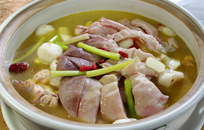 4、在洗好的猪肚里塞进处理好的鸡,猪肚与鸡的空隙里再塞些糯米,然后把猪肚的开口处用线扎紧封口,把这些东西放入高压锅,加盐少许,加葱结,姜块,胡椒,党参,玉竹,黄酒等,再加入水,压45分钟即可。