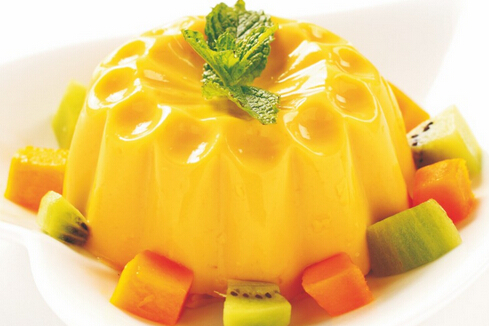 原料:椰汁150克、芒果350克、白糖50克、吉利丁片15克、柠檬汁5毫升