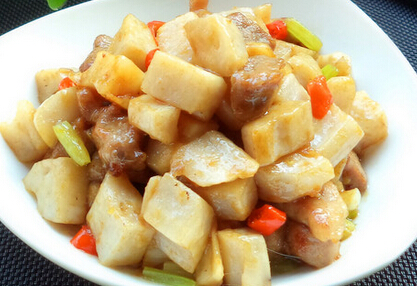 5、炒至藕丁变色,加入蒜子继续炒香;
