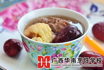 3、把排骨和玉米、红枣放入养生壶中,加入1000ML水,按下养生汤程序。