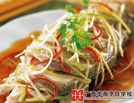 4.将锅中汤汁倒于盘底,将蒸熟的鱼摆好,上面撒上葱、姜丝,锅中橄榄油烧至七八成热时浇在摆好葱,姜丝的鱼上即可。