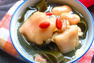 2.猪手块飞水捞出,煲内注入清汤,加入猪手葱姜绍酒煲30分钟,放入海带、花生米、煲20分钟;