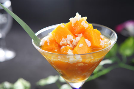 3、果汁放凉后,将凉的南瓜块放入果汁中,即可饮用。