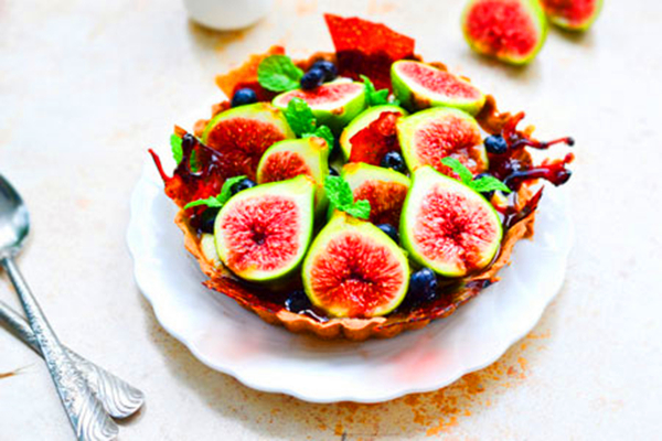 13、浇上卡仕达酱,加上拔丝无花果、装饰糖片即可。
