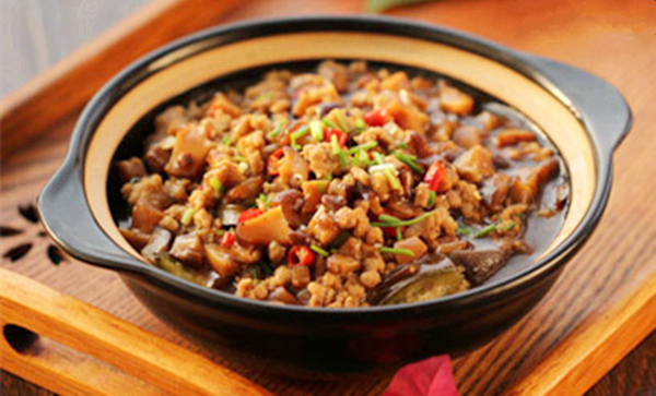 5、再加入盐等调味料翻炒均匀后盛入煲中;