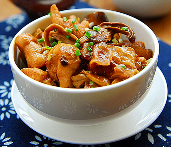3. 将鸡改成条块,定于碗中,三菌放于其上,吃好味,上笼蒸熟;