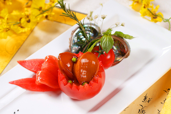 做法:1、番茄烫去皮,一个切成花状装入盅里。