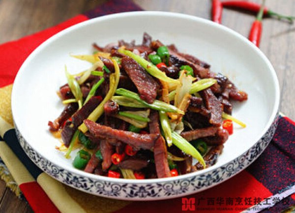 材料:烟薰牛肉200克,香芹100克,青椒20克,红椒10克,姜丝10克;植物油2大勺,鸡精1勺