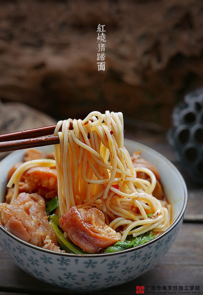 4、接下来就是煮面了,把煮好的面条捞起放在碗里后,再淋上几勺红烧猪蹄,糯糯的口感,加上粘粘的汤汁,美味!