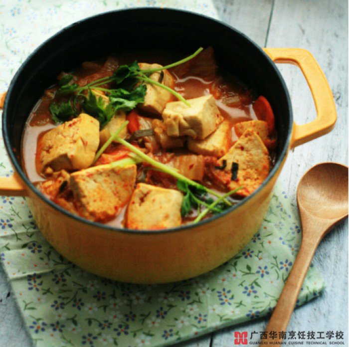 用料:南豆腐250克、辣白菜100克、青红尖椒各1个、色拉油20克、韩式辣椒酱20克、鸡精适量
