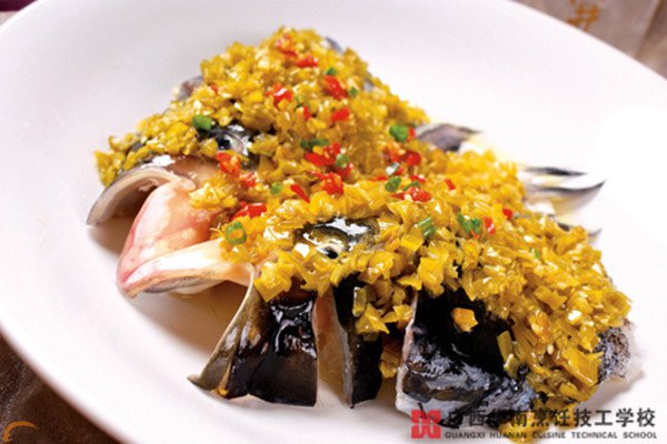 3、将腌制好的鱼头放入盘中,上面放入调好的开胃料(用切碎的青红剁椒调制);
