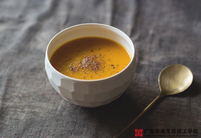 4、用手持搅拌机将炖锅内的食材搅拌至顺滑,用盐和黑胡椒调味,完成南瓜汤。