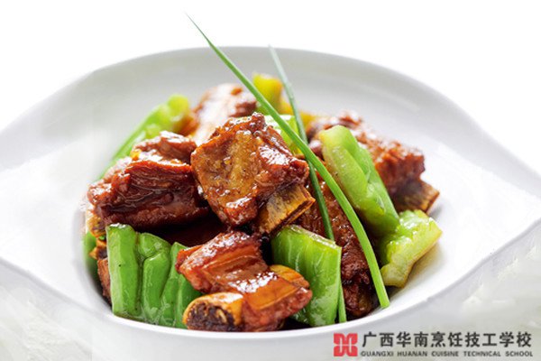 4、炒锅注入油,放入冰糖用中火加热至糖融化,泛起大泡时,放入煮过一水的猪肋排,调成大火快速翻炒至均匀地裹上糖色。