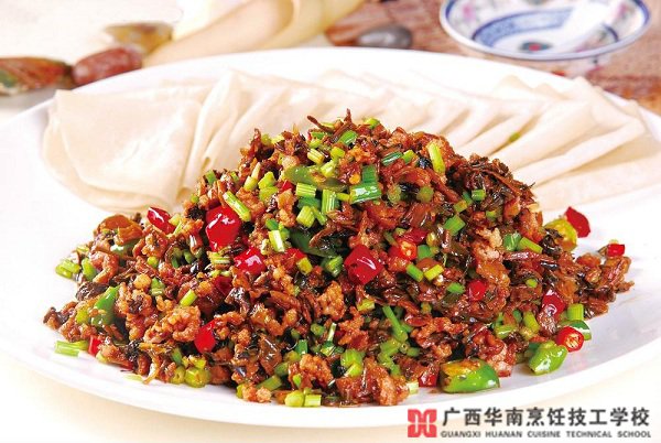 3、下入外婆菜翻炒,加少量鸡精炒匀即可起锅。