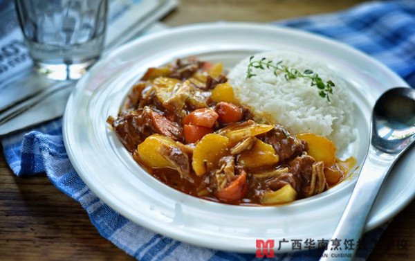 辅料:番茄酱2大勺,面粉1勺,糖1小勺,盐3克,香草适量(百里香,迷迭香),黑胡椒碎适量香草牛肉筋饭的制作步骤