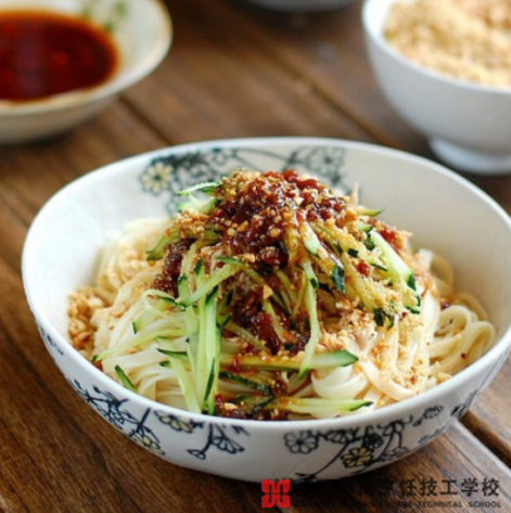 6、水提前在冰箱冷藏下,倒入面条过下凉,沥干水分;