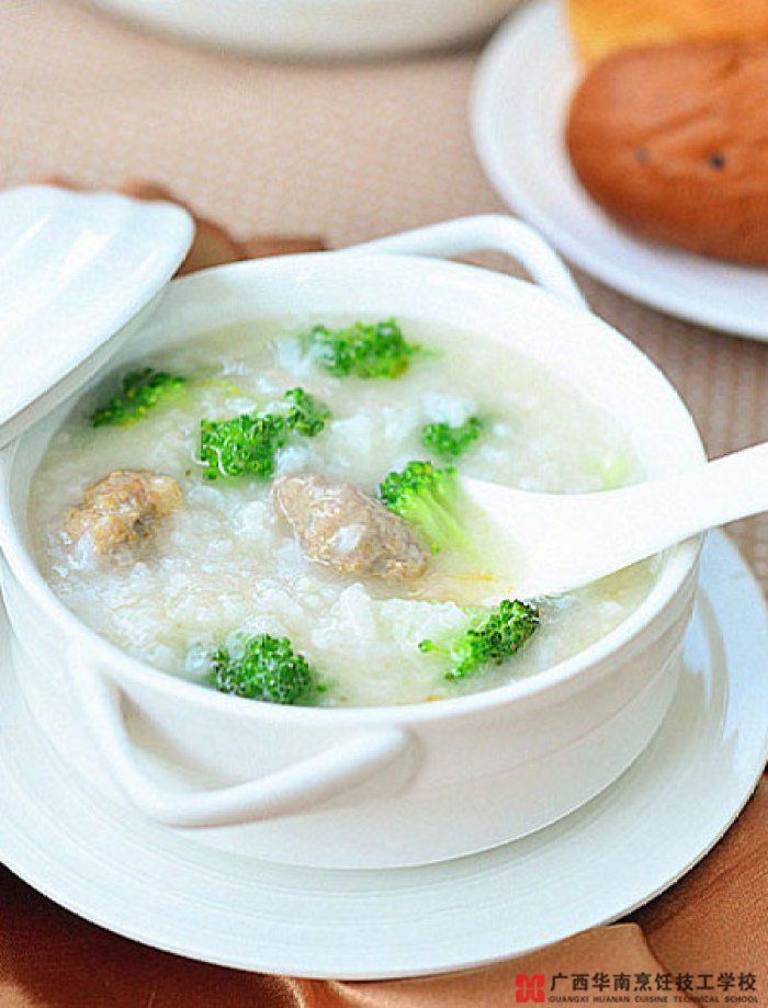 材料:西兰花半棵、猪肉末150克、大米100克、盐适量、芝麻油适量、姜少许、料酒半汤匙、酱油半汤匙、淀粉半汤匙