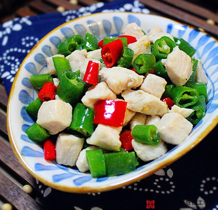 材料:鸡胸肉300克、青椒150克、红辣椒2个、蒜适量、姜适量
