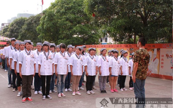 广西新闻网记者报道:时值中秋、国庆到来之际,在金秋送爽的9月,广西华南烹饪学校2012级新生用他们的军训汇演喜迎双节。