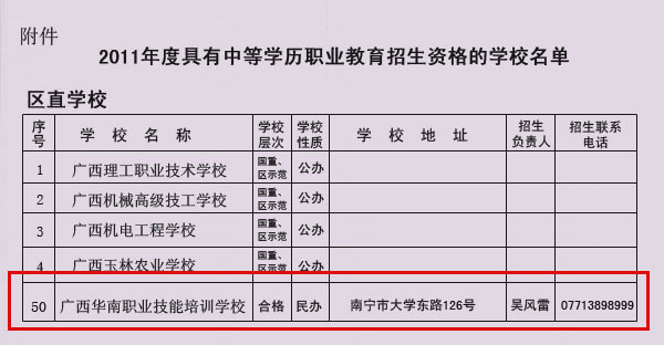 根据区教育厅、区人力资源与社会保障厅下发的《桂教职成〔2011〕24号》通知精神,我广西华南职业技能培训学校完全具备中等学历职业教育招生资格,并成为区直学校中唯一具备该资格的民办学校,报读我校的学生,毕业时将获得区教育厅颁发的毕业证书。