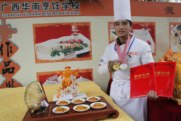 广西华南烹饪学校大厨精英113班的学生,在第19届厨艺新星大赛中获得雕刻特金奖、热菜银奖的双料大奖。