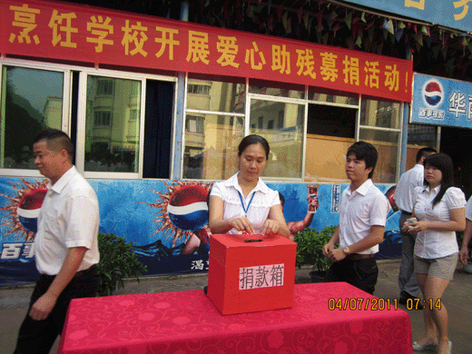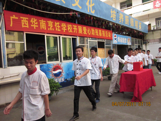 7月4日早上,我校响应南宁市西乡塘区政府的号召,在全国第二十一个“助残日”到来之际在烹饪校区食堂前操场举行了“助残捐款”仪式。全校师生参加了此次活动,在仪式上首先由校长向学生进行了助残教育,然后学生代表作了表态发言。其后在全校领导的带领下进行了捐款活动。本次活动的所有捐款将交付南宁市西乡塘区政府从事特教事业。