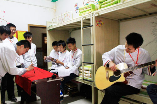 没有上课的时候,同学们若不在操场上嬉戏玩耍,不在自习室温习功课,不在图书馆阅览百书,便会回到寝室享受或安静宁神或热闹快乐的生活。在寝室,既可以一个人挺音乐,习字看书,也可以两个人围坐下棋,也可以多人一起唱歌、谈论生活百态、学习情况与未来理想。环境对人的发展具有重要的影响,广西华南烹饪学校深知寝室对学生们的重要性,班主任经常在寝室组织娱乐活动,有书法比赛、才艺展示,还有寝室联谊等等数十种不同的娱乐活动。这些活动不仅丰富了学生们的校园生活,还帮助同学们建立了相互之间的友谊、培养了他们乐观开朗的生活态度。