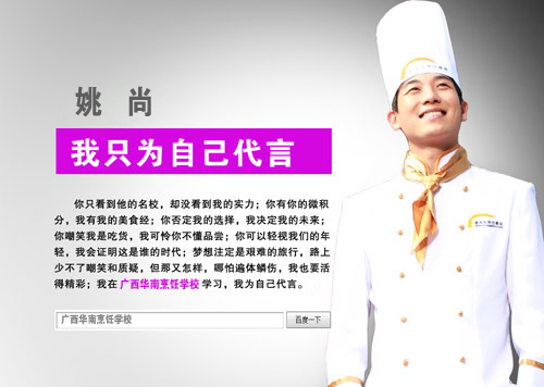 “你只看到他的名校,却没看到我的实力;你有你的微积分,我有我的美食经;你否定我的选择,我决定我的未来;你嘲笑我是吃货,我可怜你不懂品尝;你可以轻视我们的年轻,我会证明这是谁的时代;梦想注定是艰难的旅行,路上少不了嘲笑和质疑,但那又怎样,哪怕遍体鳞伤,我也要活得精彩;我在广西华南烹饪学校学习,我为自己代言。”