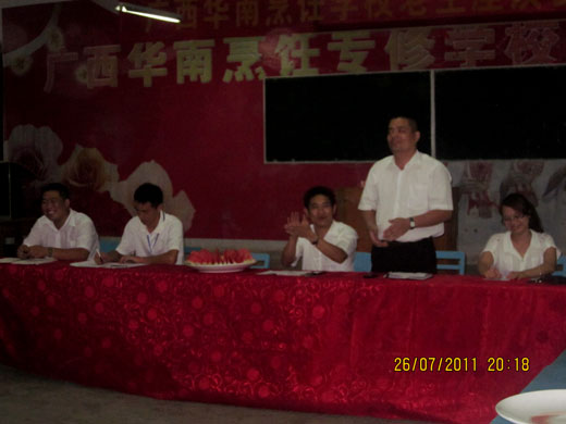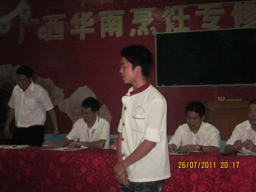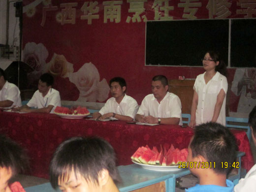 2011年7月26日晚上7点半,广西华南烹饪学校组织召开老生座谈会,教务科魏老师、学生科司老师、后勤保障部万老师、班主任彭老师和姚老师等参加了座谈会。