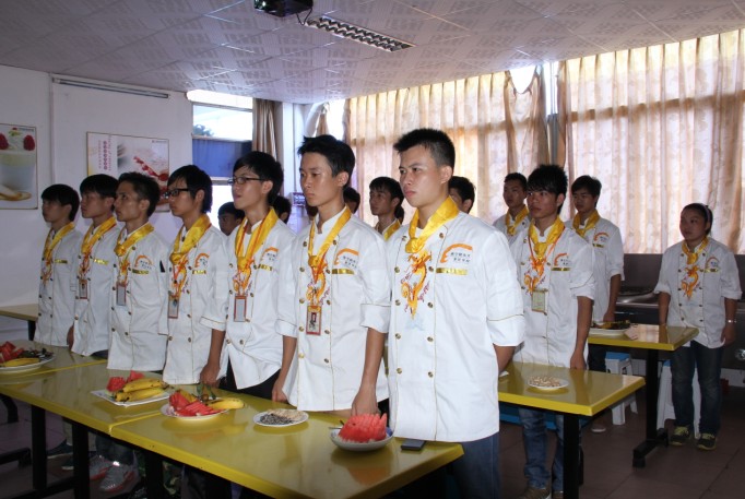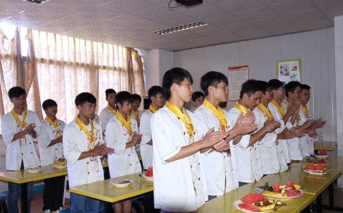 2013年8月16日下午,广西华南烹饪学校两年制金牌五班在大学路校区多媒体教室举行了隆重的开班典礼。经过前阶段的军训,同学们已经慢慢的适应了学校的生活。新生学子们满怀激情地站在了人生的新起点上。典礼上由华南大学路校区主任周应斌主持,广西华南大学路校区教务主任、学生处主任及部分任课老师出席了本次典礼。