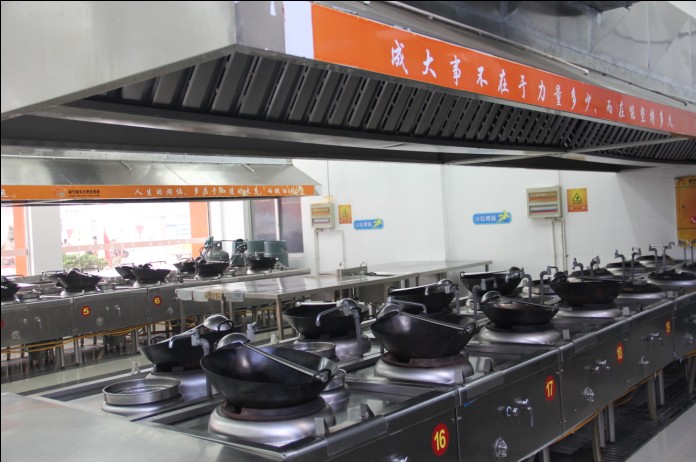 在金牌大厨教学大纲的课程安排中,学校坚持以实践操作为主,理论为辅的教学模式,其中学生实现100%实操训练。同时学校自成立以来,按照宾馆酒店厨房要求标准配置,投资上千万元建设标准化理论教室、演示大厅、实习大厅,拥有高档宾馆酒店的模拟餐厅,以保证实现“一人一灶”的实操训练需要。