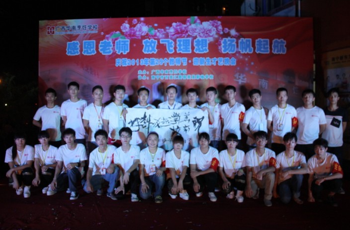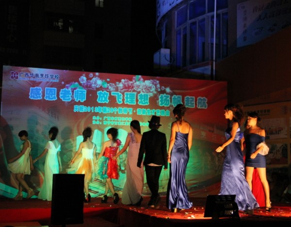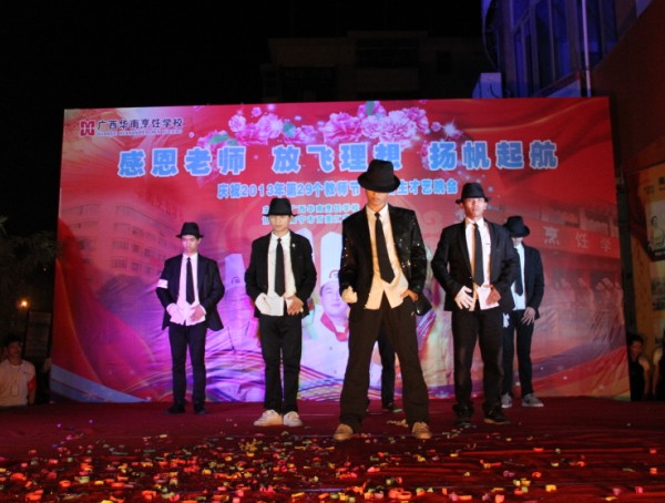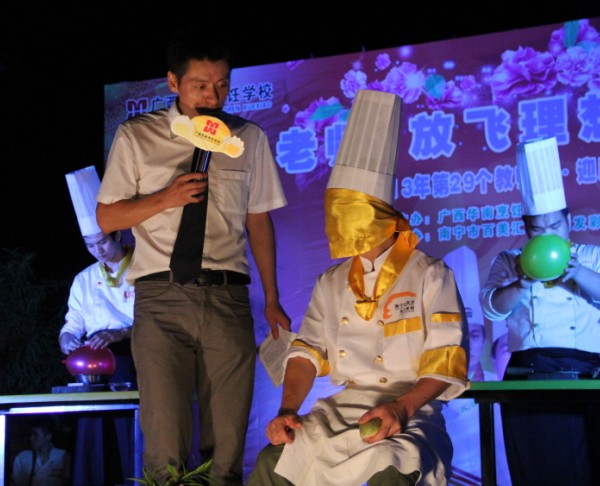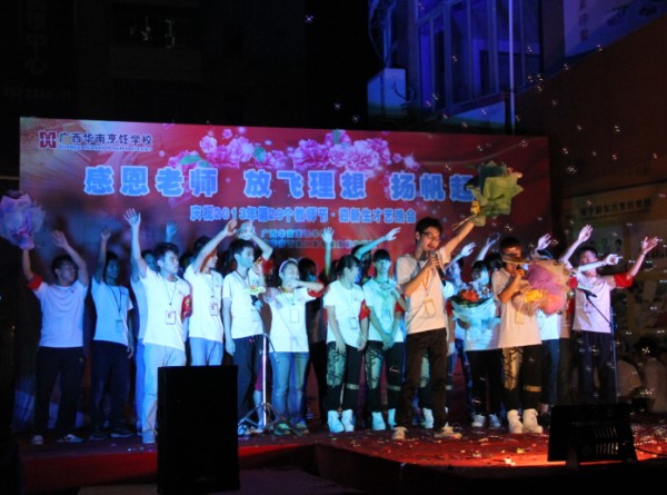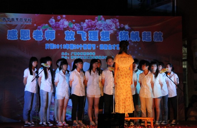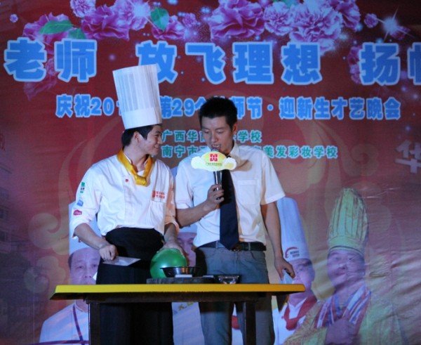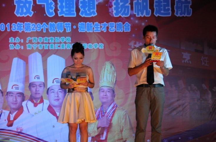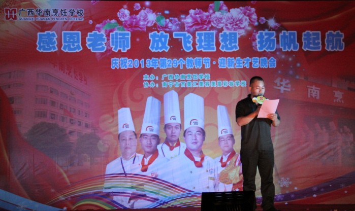 首先,全国餐饮业国家一级评委、广西区烹饪协会常务副会长何逸奎上台致辞:“他代表区烹饪协会祝福广大教育工作者节日快乐,祝愿广西华南烹饪学校越办越好”。其次,广西华南烹饪学校校长致辞:“他代表学校祝福奋战在教育工作上的每一位教师表示衷心感谢,希望广大教师能够总结经验、开拓创新,争取工作再上新台阶”。 伴随着倒计时,青春欢快的音乐,最后广西华南烹饪学校校长宣布2013年“感恩教师、放飞理想”大型晚会隆重开始。